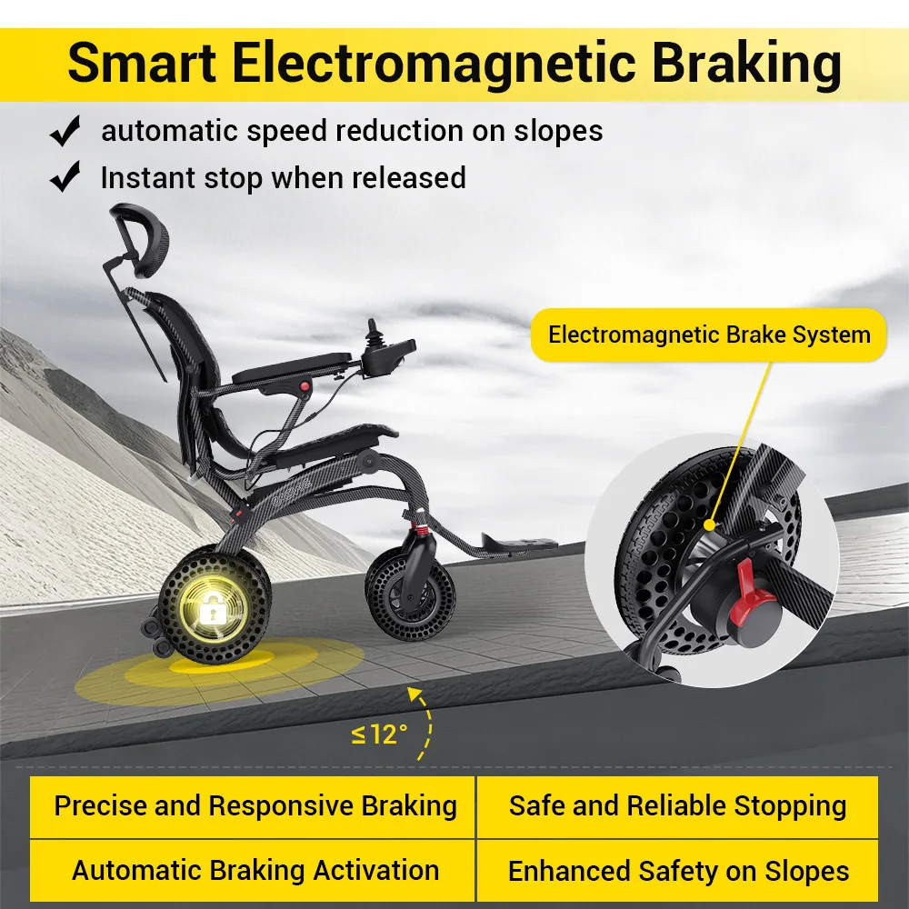 - Comprehensive Safety Features: B10 electric wheelchair is equipped with intelligent electromagnetic brake system, Anti-Tip Rear Wheels, Seat belt and LED Safety Lights. We care about your safety.
